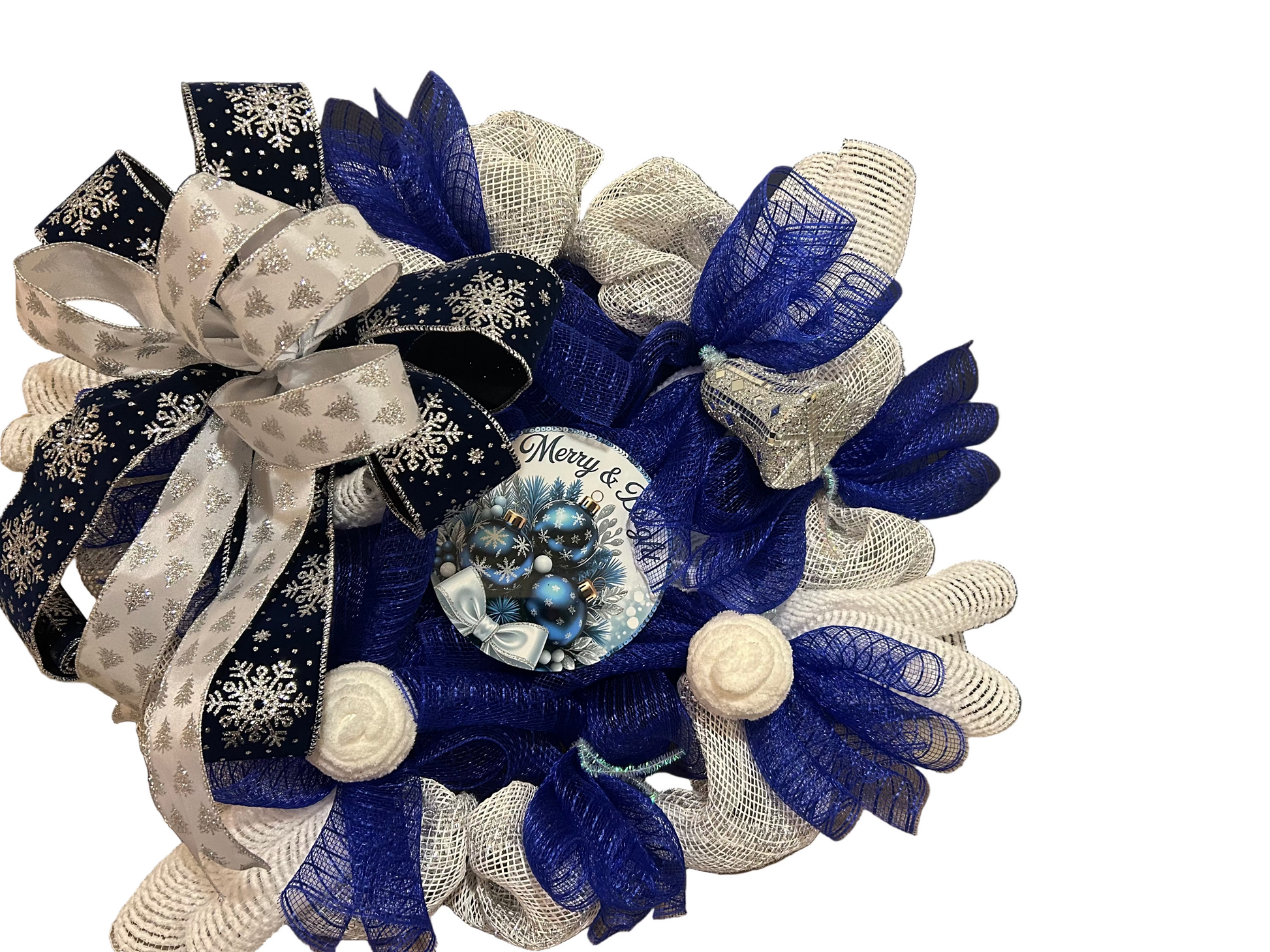 A beautiful blue and silver and white delco mesh wreath. The blue and silver wreath material is made of mesh with shimmery streaks in the middle. The bow material is made of polyester fabric and glitter. The dark blue ribbon has snowflakes and the white ribbon has Xmas trees. The wreath is a great center piece for your family from or your front or back door. This wreath screams Xmas.