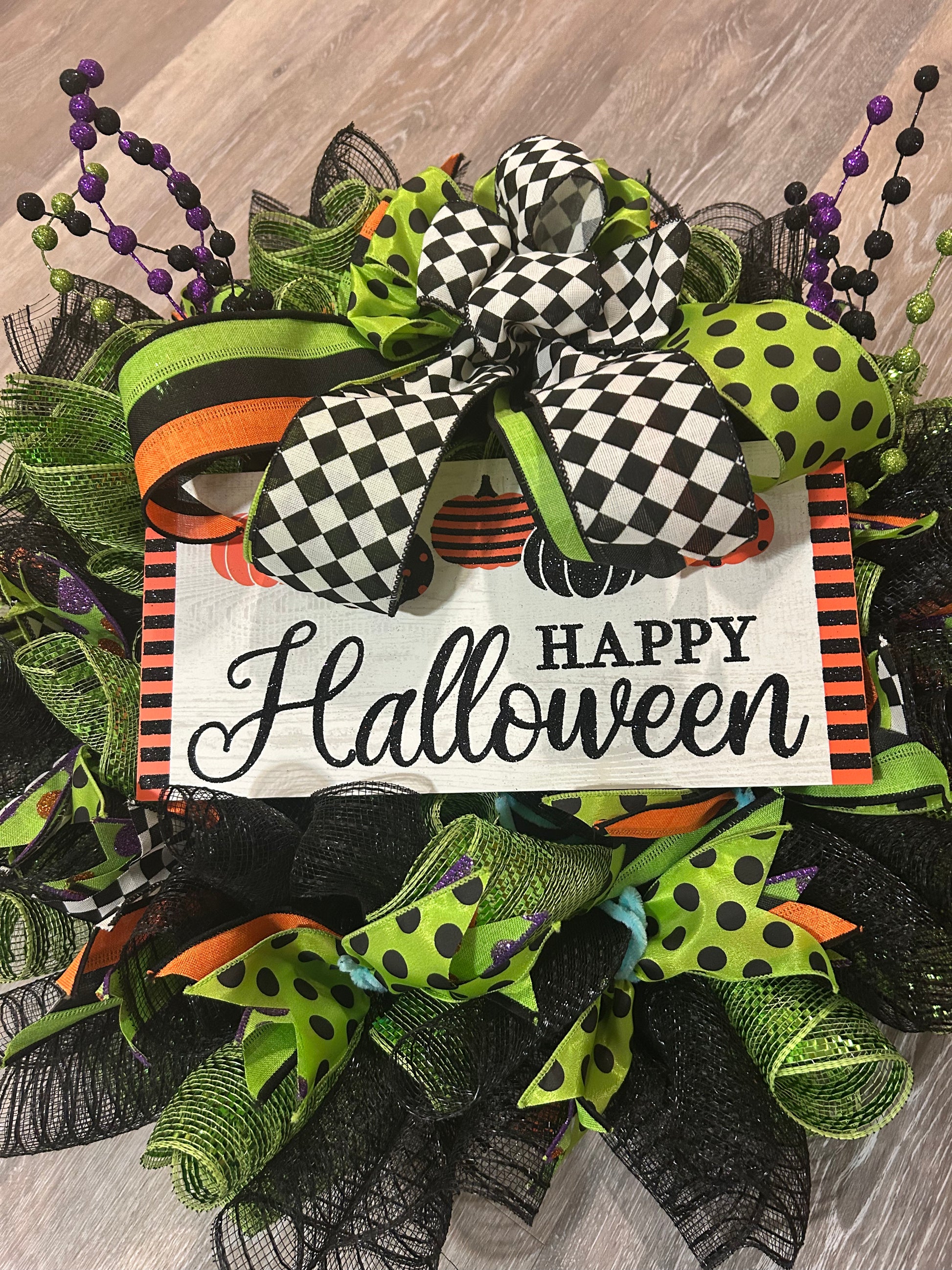 A beautiful green and black Halloween wreath decorated with delco mesh material. The mesh is held together on a metal 14 inch frame. The sign is made of wood with black and orange pumpkins on the front with a white background. This Halloween wreath would look great on any door in your home. Your grandchildren or students in your class would never stop talking about it.