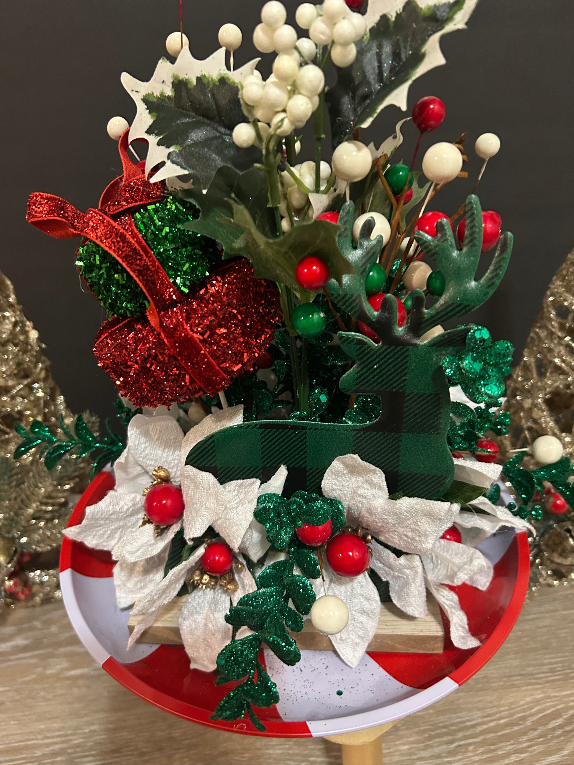 Another beautiful green and black reindeer surrounded by red and green decor. The reindeer is sitting in a peppermint plate with holly and a red and green decor present at the top. A great gift idea for a friend or neighbor.