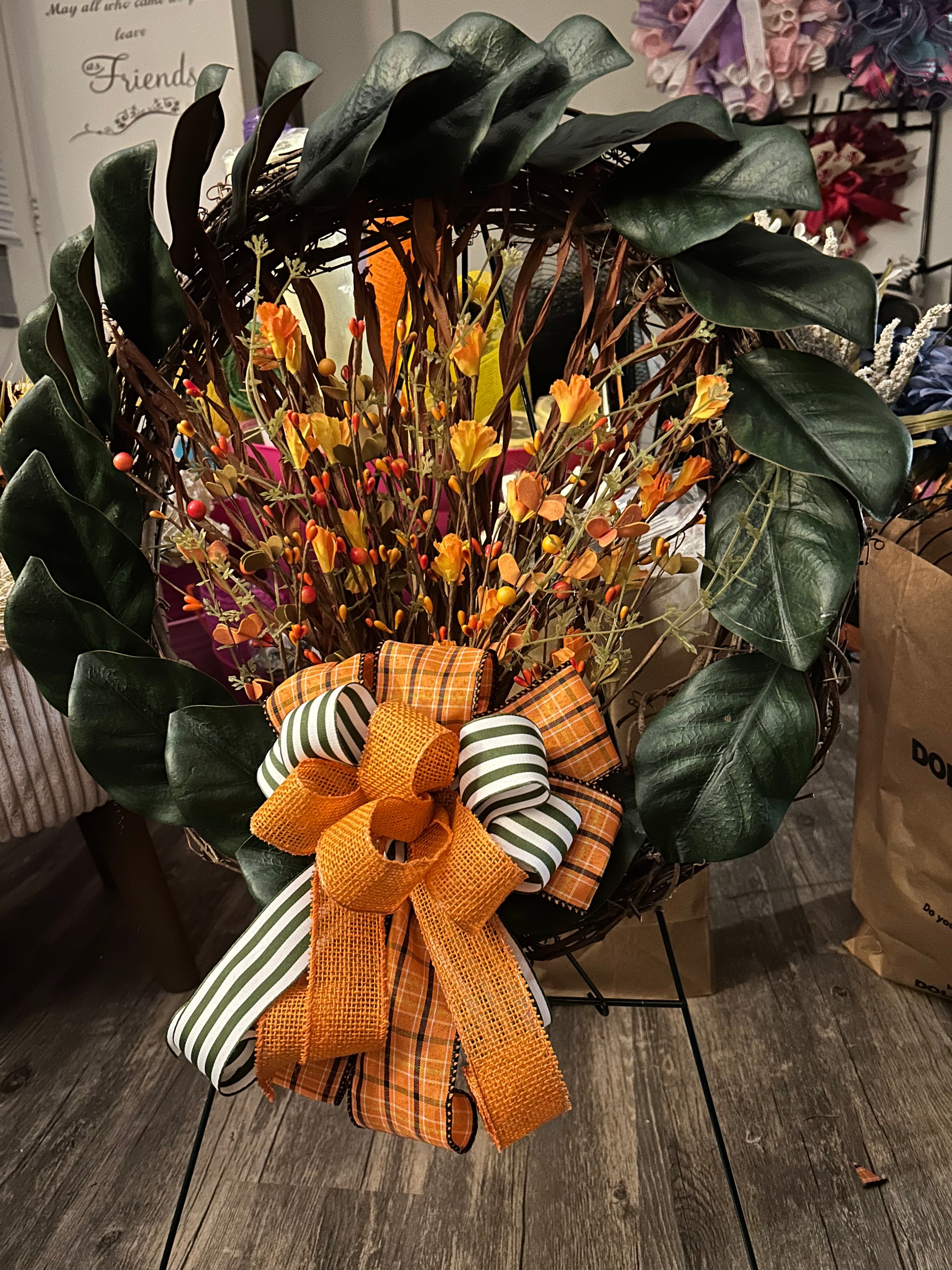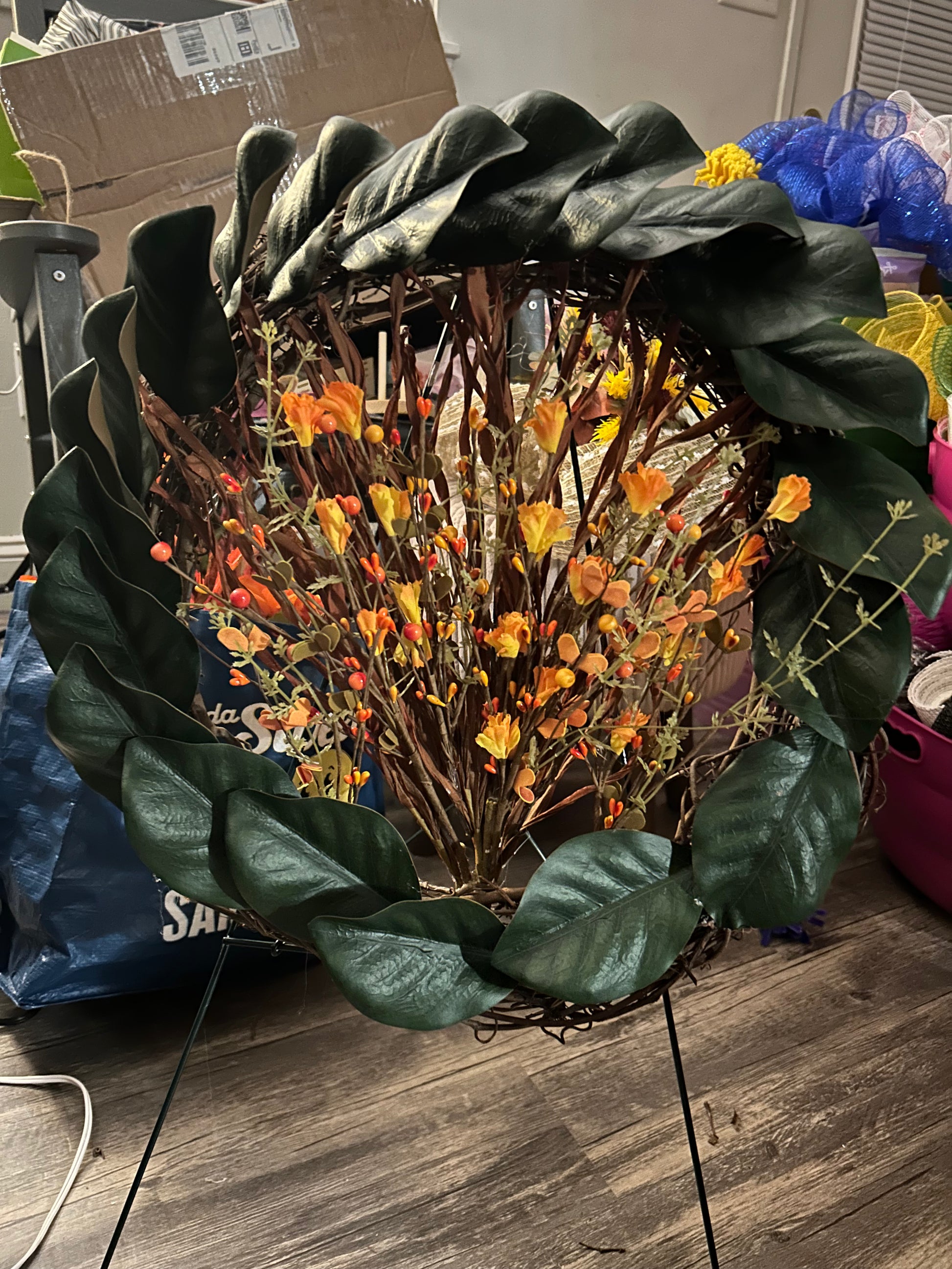 Pretty big green plastic leaves that circles the wreath. Frame is made of tree branches and twigs. Beautiful orange and yellow little flowers with beads on the stems made of plastic material. Great to hang on a dining room wall or doorway.